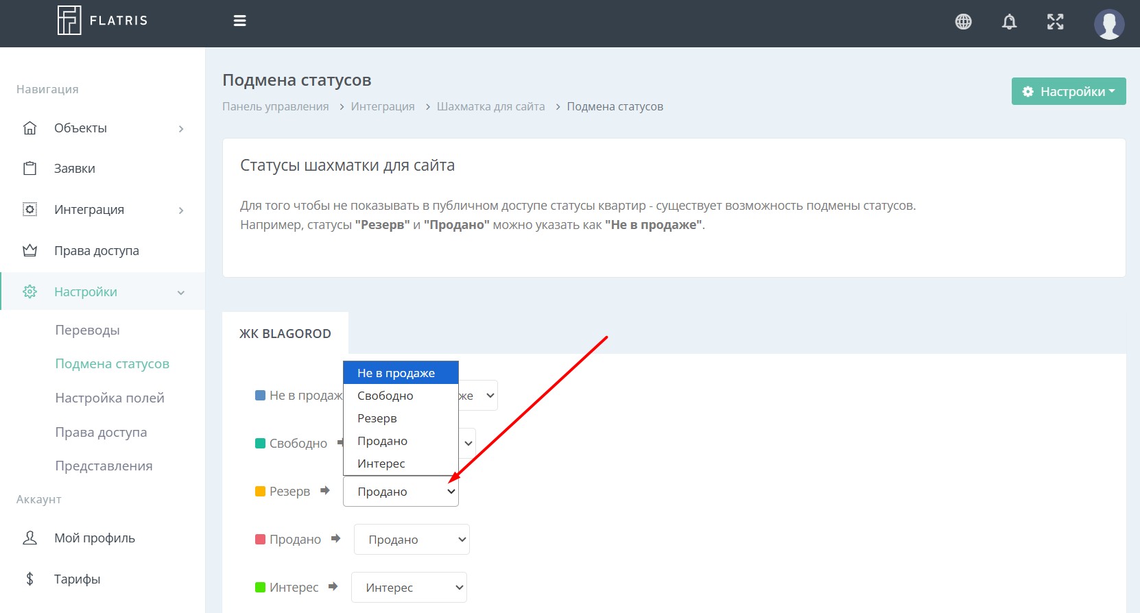 Для того чтобы не показывать в публичном доступе статусы квартир - существует возможность подмены статусов.